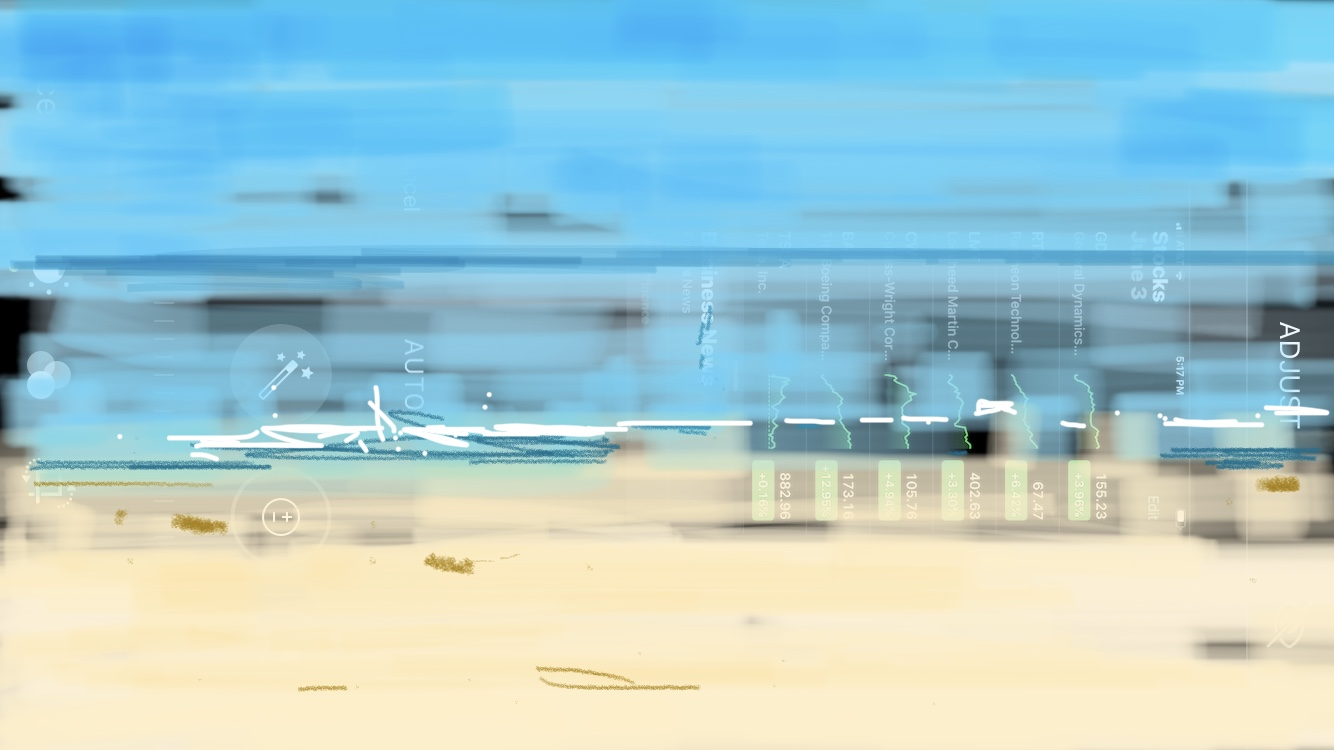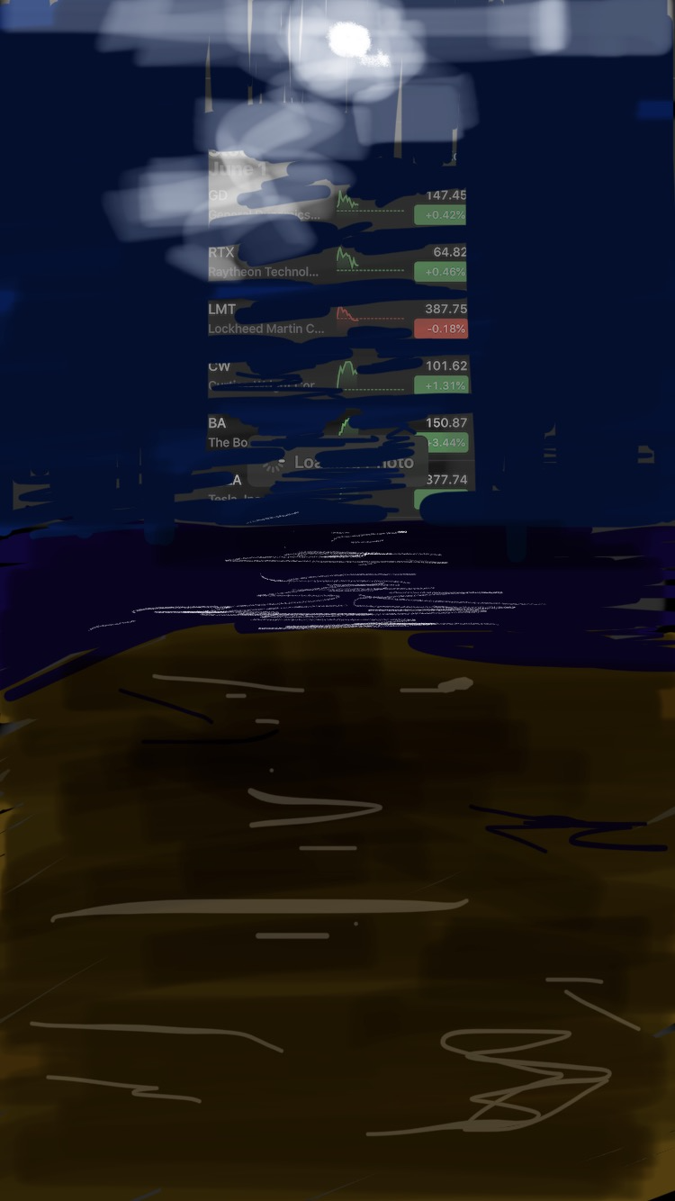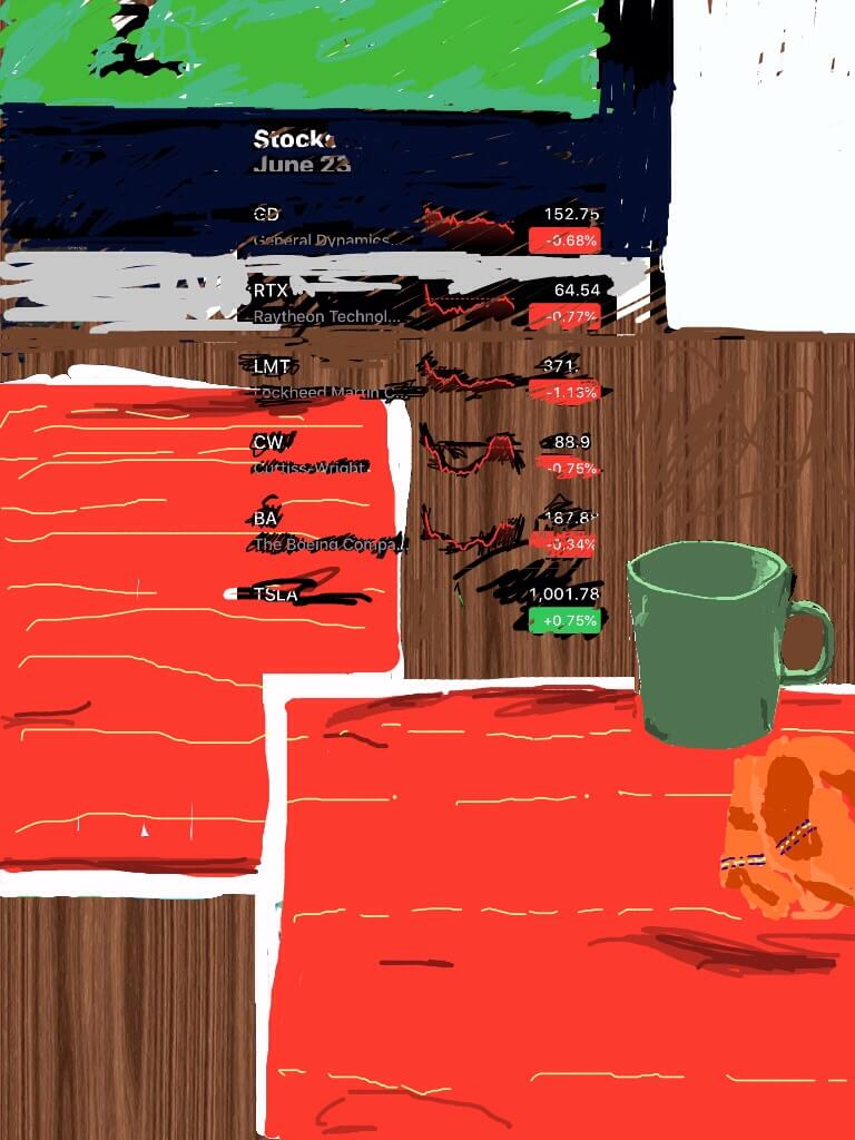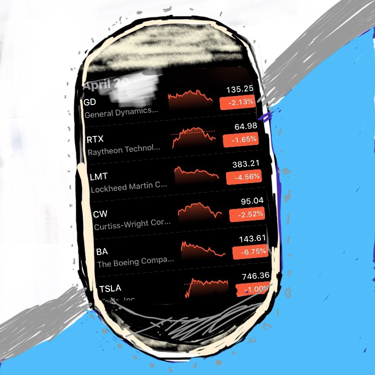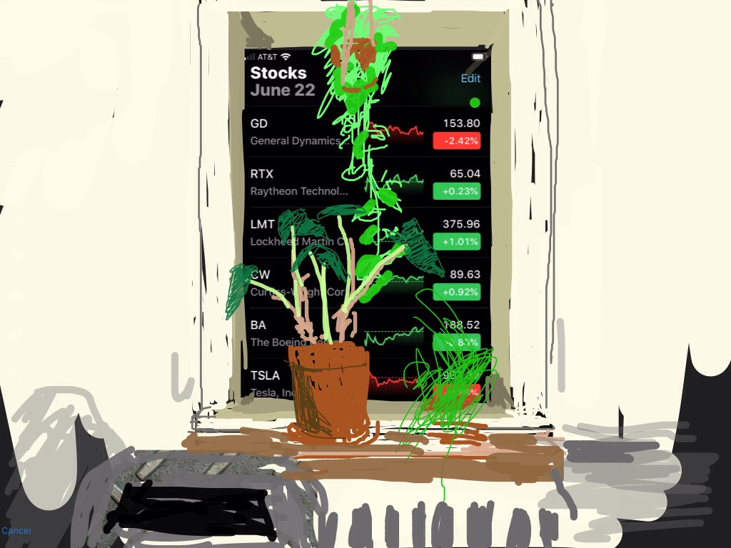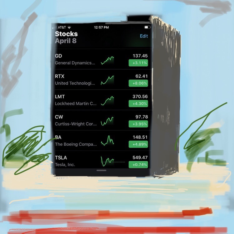 These are drawings I make on my Iphone combining imagery from banal snapshots and daily Apple Stocks app quotes. The stocks shown comprise a portfolio of shares in aerospace defense corporations that I have held since 2016.